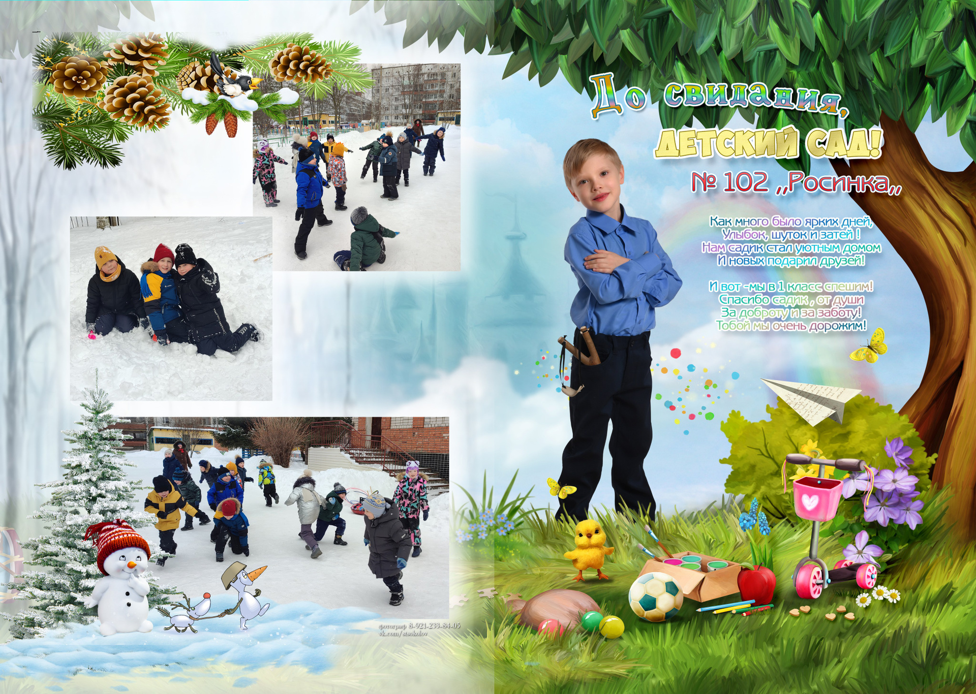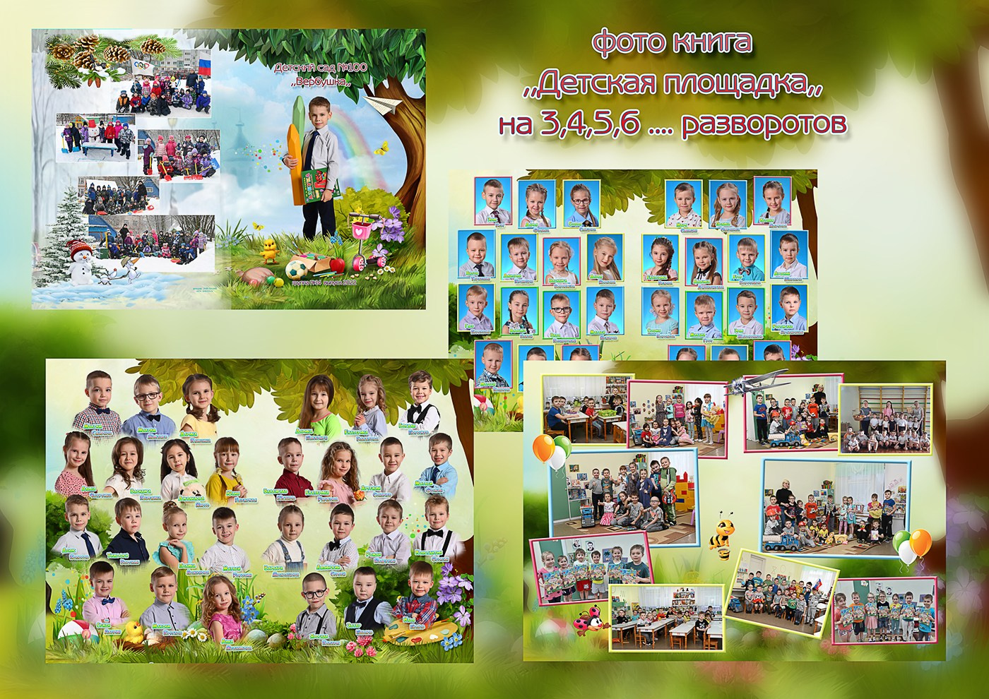 Интересный альбом для выпускников детского сада. Фотографирование всех выполняется в полный рост… Портрет выпускника выполняется на обложке альбома. Как альтернатива для более строгого оформления делаем и на первом развороте совместно с воспитателями. Виньетку всех детей делаем по плечики или в полный рост. Количество жанровых разворотов определяется родителями, можно сделать сколько угодно.....