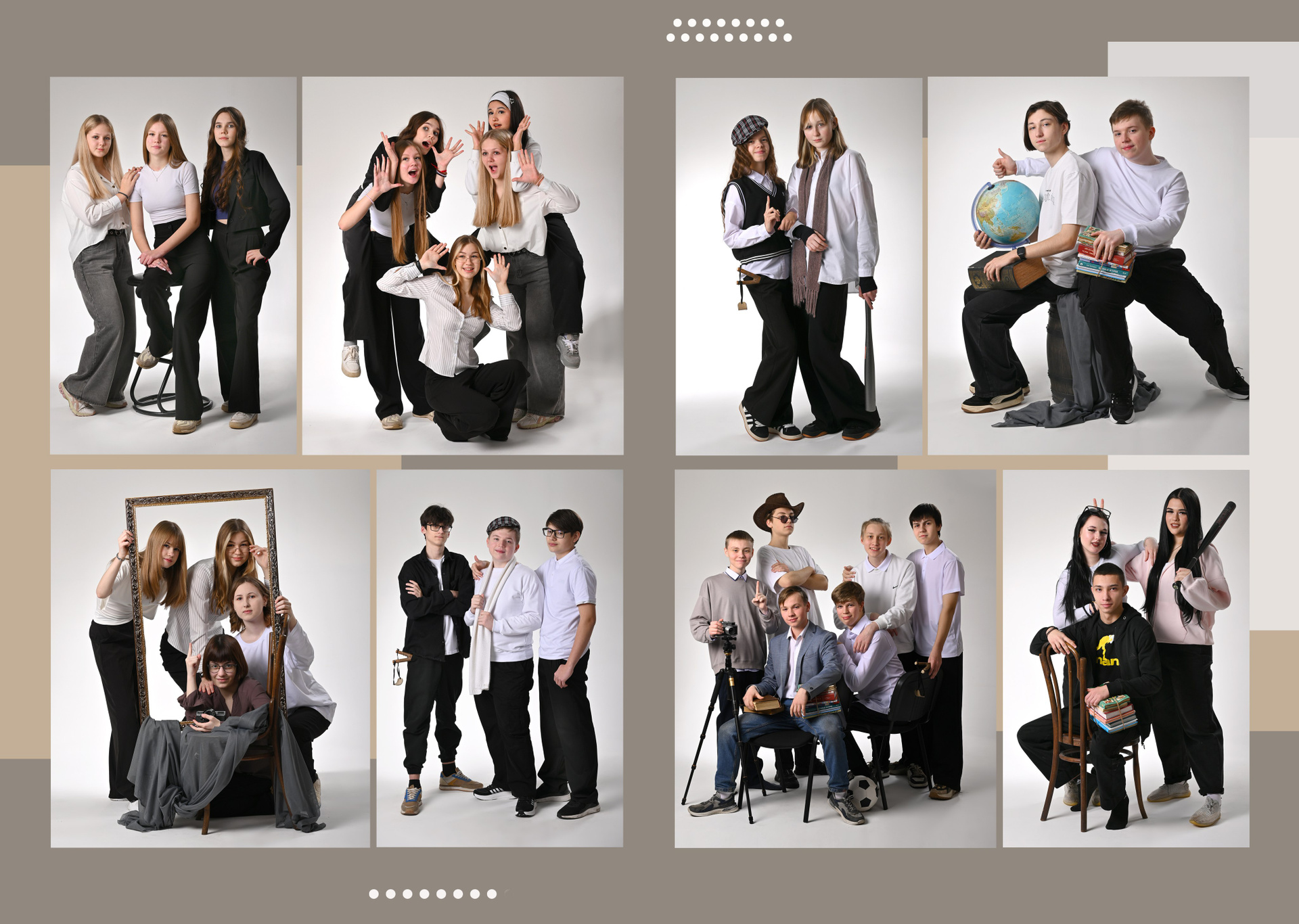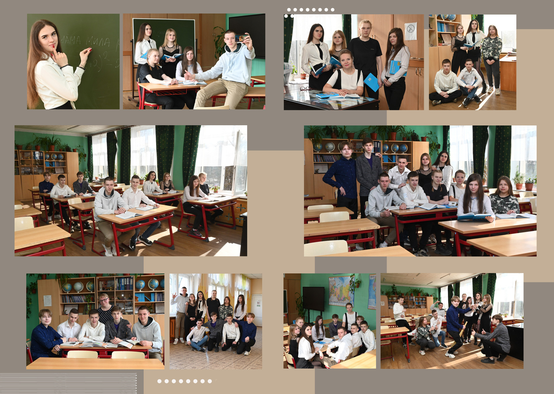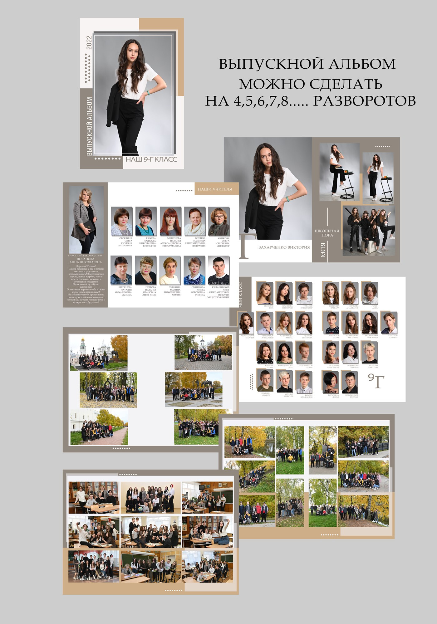 Альбом выполнен в тёплых коричневых тонах. Портрет выпускника по желанию можно сделать или на обложке или на первом развороте вместе с учителями. Возможна индивидуальная страничка с фотографиями выпускника, в базовую стоимость не входит. Разумеется у каждого ученика своя страничка с его выбранными снимками. Не ограниченное количество жанровых разворотов в альбоме. Их можно сделать в школе или где-либо на прогулке.