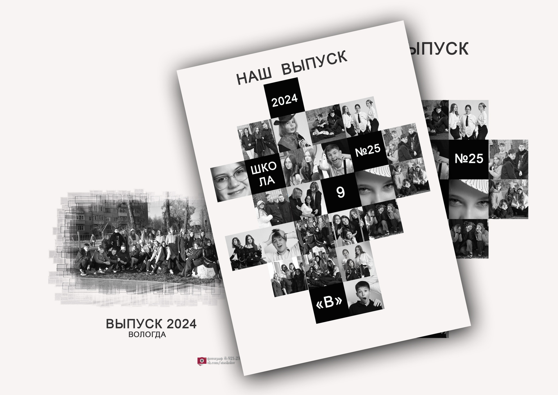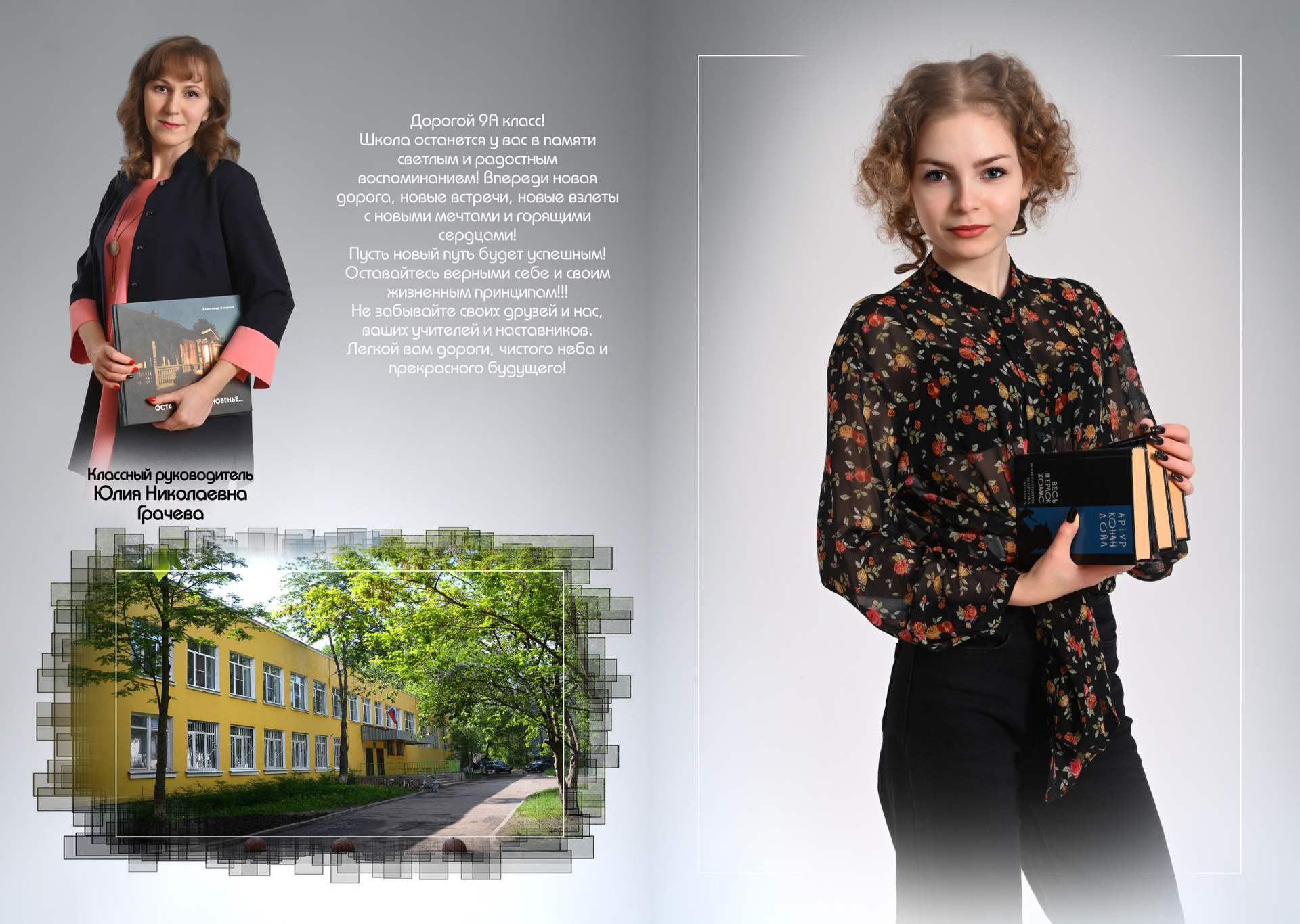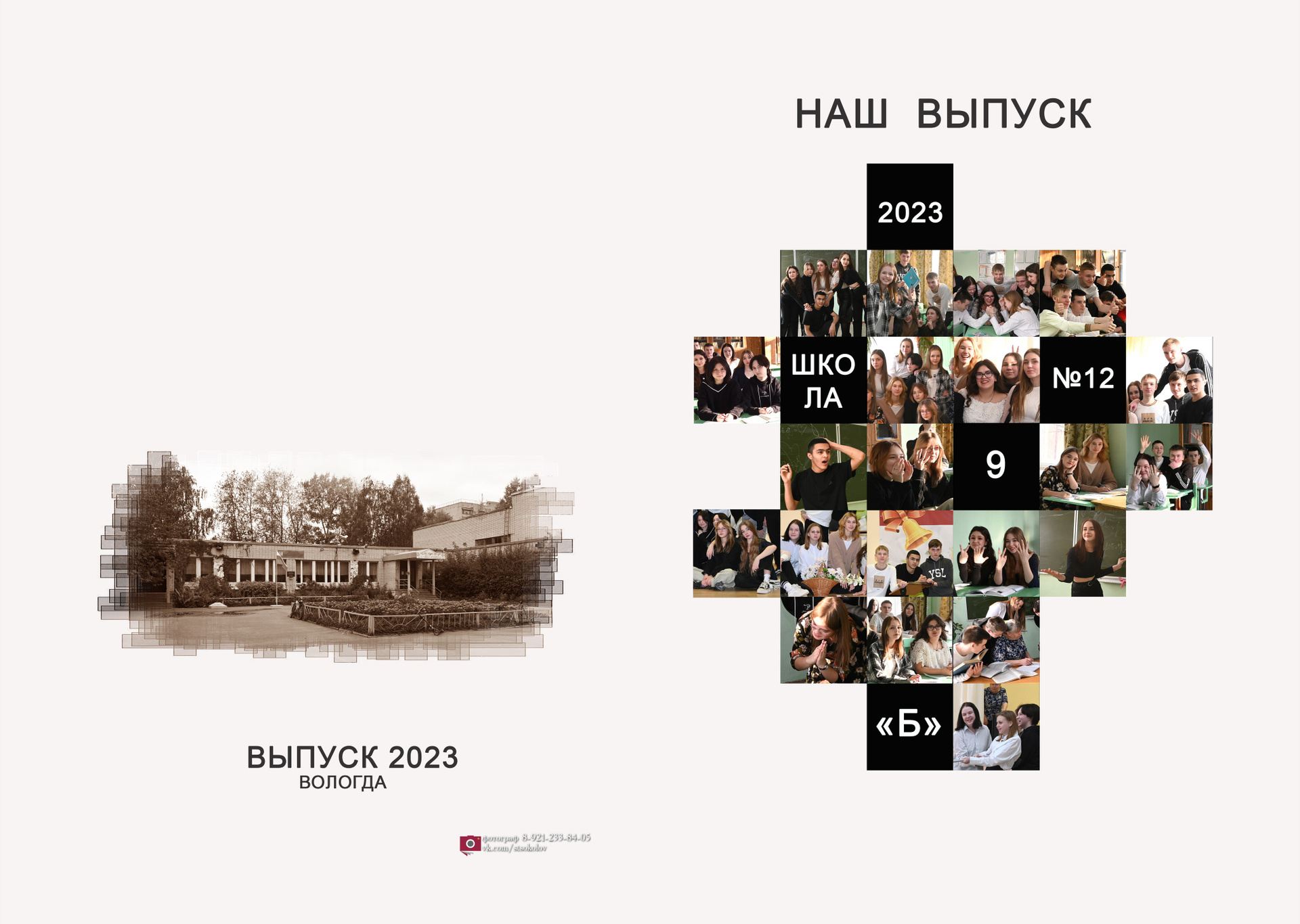 Обложка альбома выполнена в виде маленьких режимных снимков из жизни класса. Она может быть цветной, черно-белой или в тоне сепии всё по желанию. На первом развороте учителя и портрет выпускника. Возможна индивидуальная страничка с фотографиями выпускника, в базовую стоимость не входит. Разумеется у каждого ученика своя страничка с его выбранными снимками. Дополняет альбом не ограниченное количество жанровых разворотов вперемешку с одноклассниками…