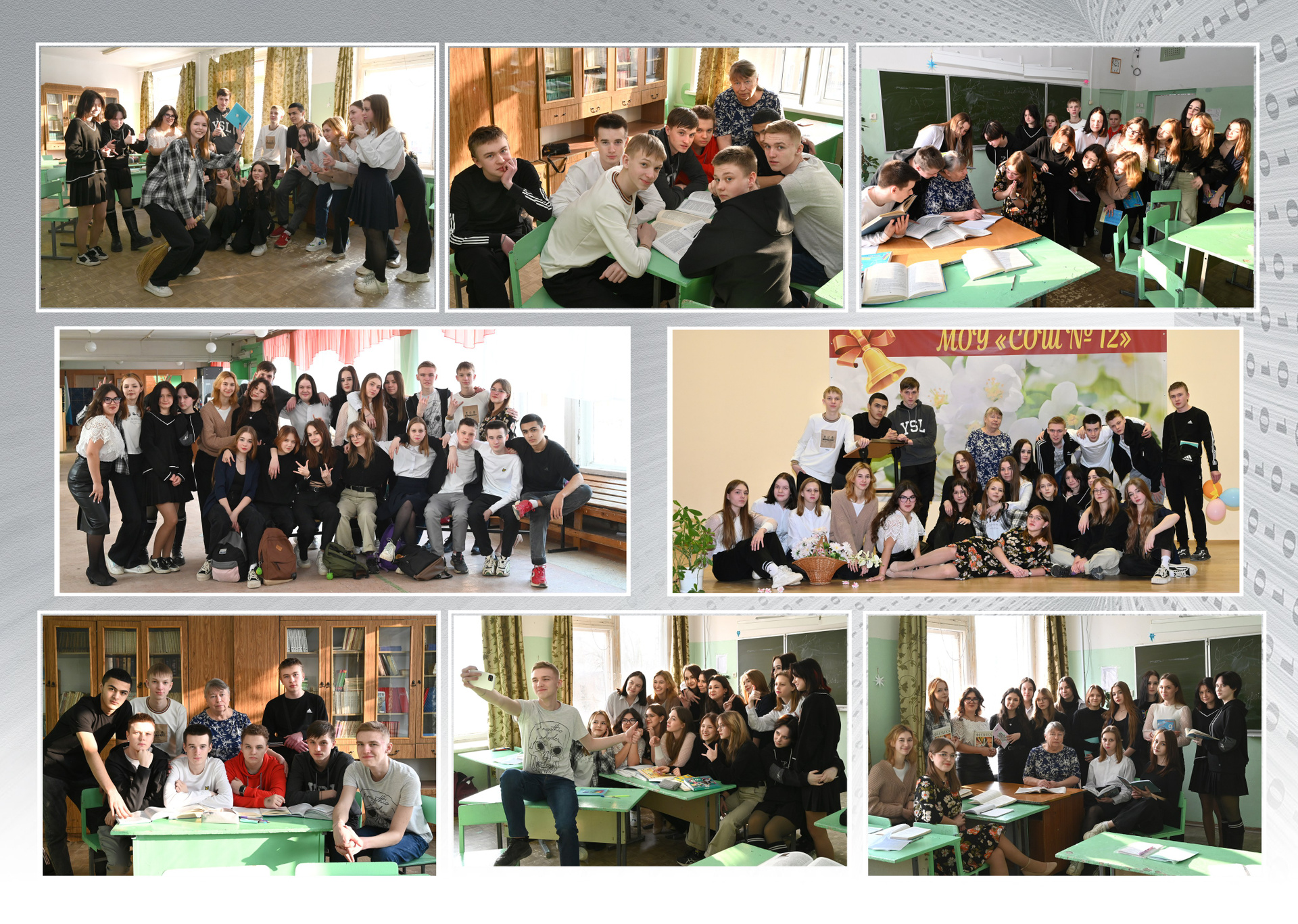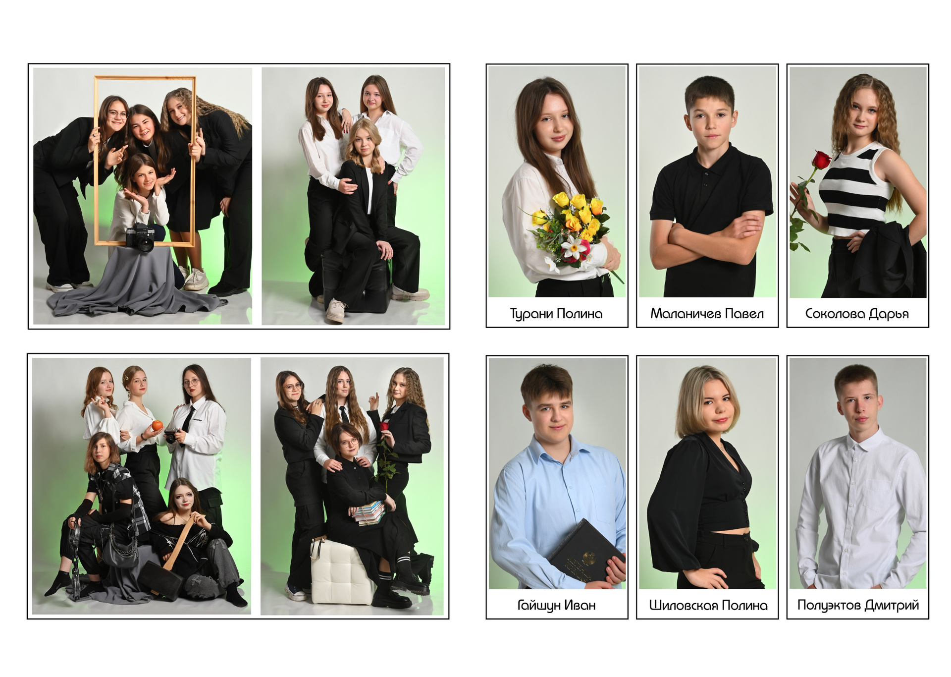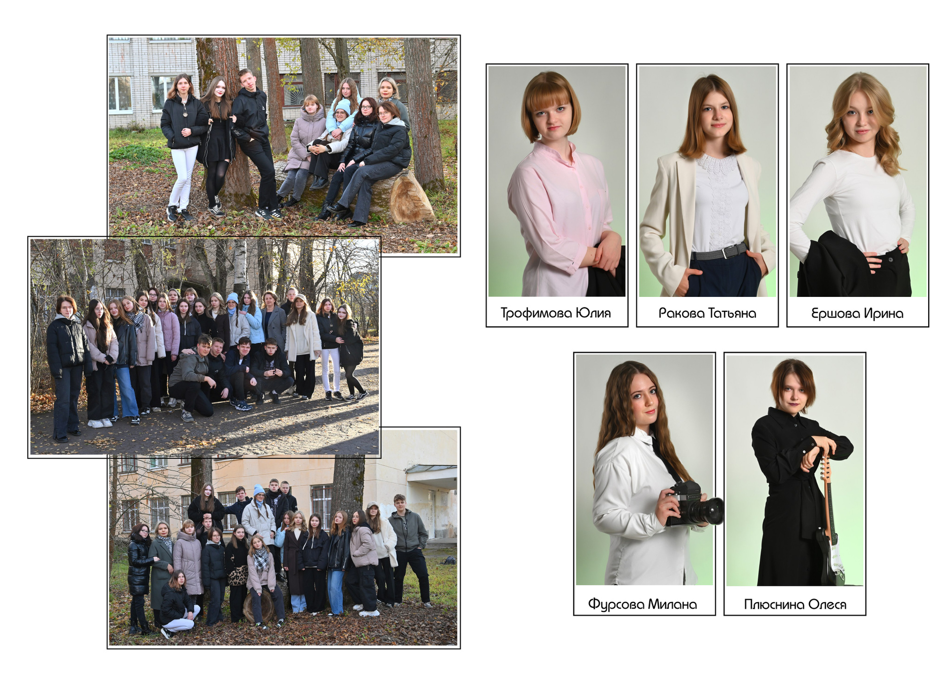 Обложка альбома выполнена в виде маленьких режимных снимков из жизни класса. Она может быть цветной, черно-белой или в тоне сепии всё по желанию. На первом развороте учителя и портрет выпускника. Возможна индивидуальная страничка с фотографиями выпускника, в базовую стоимость не входит. Разумеется у каждого ученика своя страничка с его выбранными снимками. Дополняет альбом не ограниченное количество жанровых разворотов вперемешку с одноклассниками…